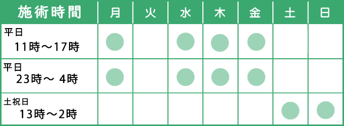 週間スケジュール 2022.03.01 « 10月3日 ~ 10月9日 » » 本日 10月3日(木) 10月4日(金) 10月5日(土) 10月6日(日) 10月7日(月) 10月8日(火) 10月9日(水) 営業時間 前半- - - - - - - 後半 営業時間- - - - - - -